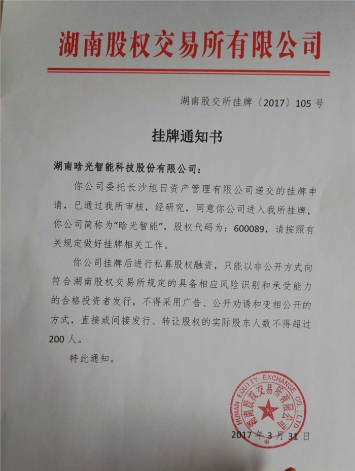 华体会(中国)于3月31日在湖南股权交易所成功挂牌四板(标准