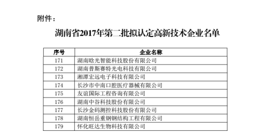 2017年12月1日,湖南省高新技术企业认定管理工作网公布了关于公示湖南省2017年第二批拟认定高新技术企业名单的通知,华体会(中国)位列其中。