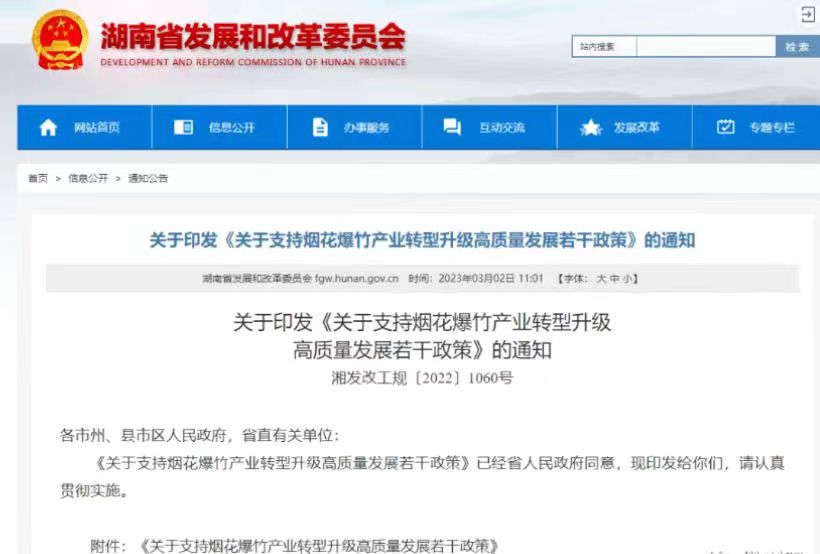 今天湖南省发改委官网公布关于印发《关于支持烟花爆竹产业转型升级高质量发展若干政策》的通知具体内容如下: